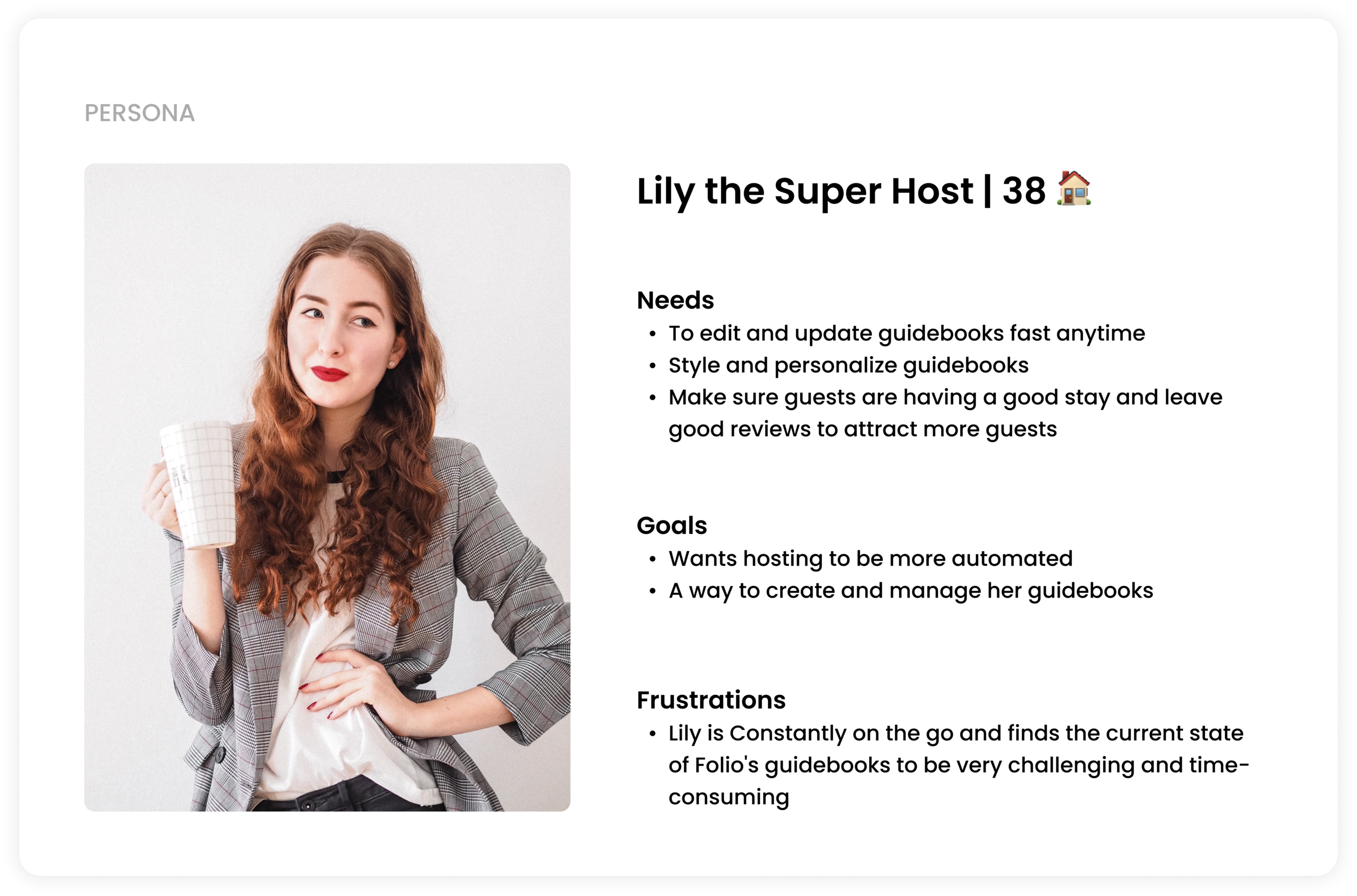 We wanted to hear the customer's point of view. Prior to our research, our client was able to provide us with a list of 11 diverse hosts who’ve consented to be a part of the UX interviewing and testing process. With these interviews, we wanted to dive deep into the hosting world and understand what it’s like to be a host using Folio.