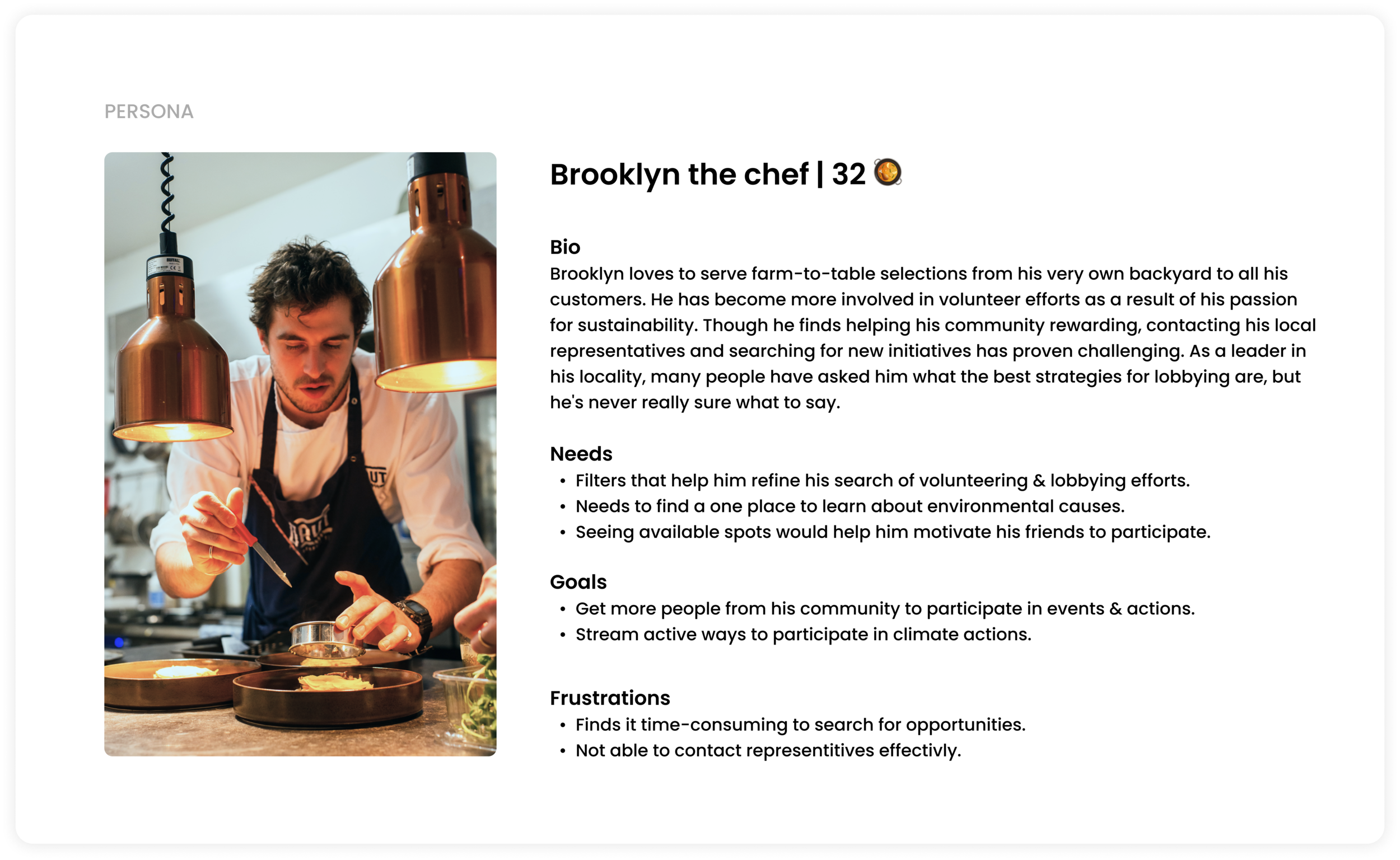 Based on Affinity mapping, we noticed that almost all the people we interviewed didn’t know how or where to find opportunities. They struggle to find trustful information about the causes they care about and they feel that they can’t do much.