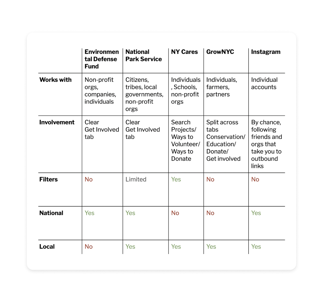 our team researched the market we intended to insert ourselves within. We noticed there was no consolidated platform or website where individuals could find opportunities for action, while specialized vocabulary often hindered them from looking further, or contacting representatives. So we began mapping out the features and offerings of organization websites, as well as some social platforms our interviewees had mentioned.